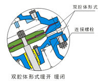 1.采用不同用途可以將兩個腔室被此隔離或相通,以實現緩開、緩閉或速閉等輔助功能,在一定程度上阻礙水錘的產生或緩解水錘的力度,保護閥后的其他設備不受損壞。除此之外,閥蓋與上腔室連為一體,使得閥蓋、上腔室、閥桿、閥盤成為整體,只要松開閥體與閥蓋的連接螺栓,即可將其一并取出方便維修及更換易損件。